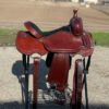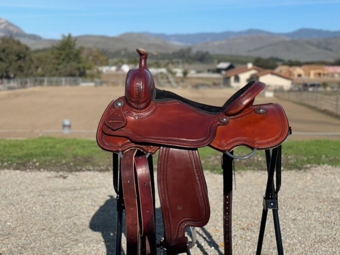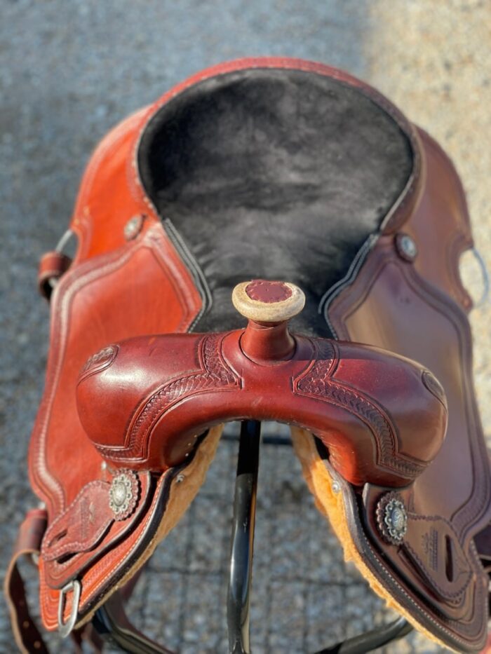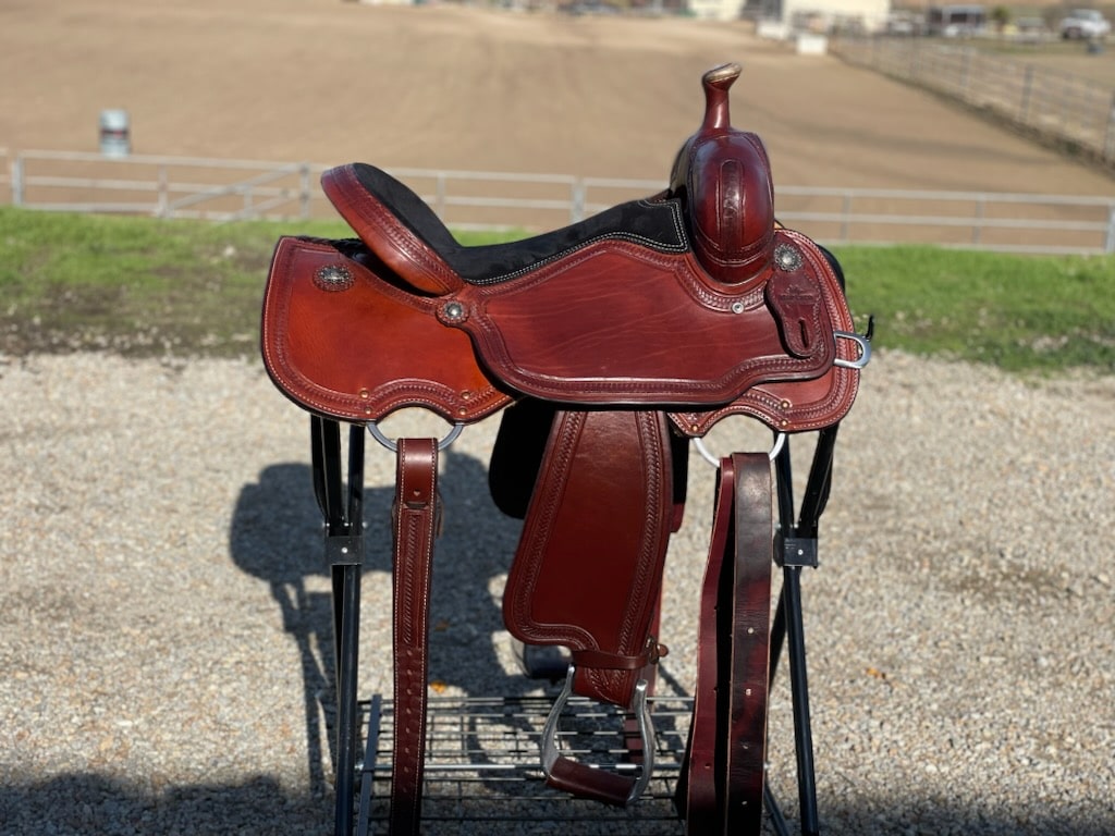 All Around 16″, 6.5″ GULLET X 11.5″ BARS, SMOOTHOUT, FULL BLACK SUEDE SEAT, 2″ LEATHER CANTLE, ALL AROUND SKIRTS, FLEECE, ST34 CONCHOS, 2″ ALUM. STIRRUPS, DARK OIL
